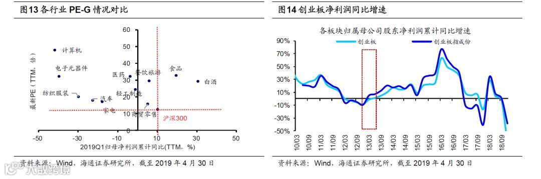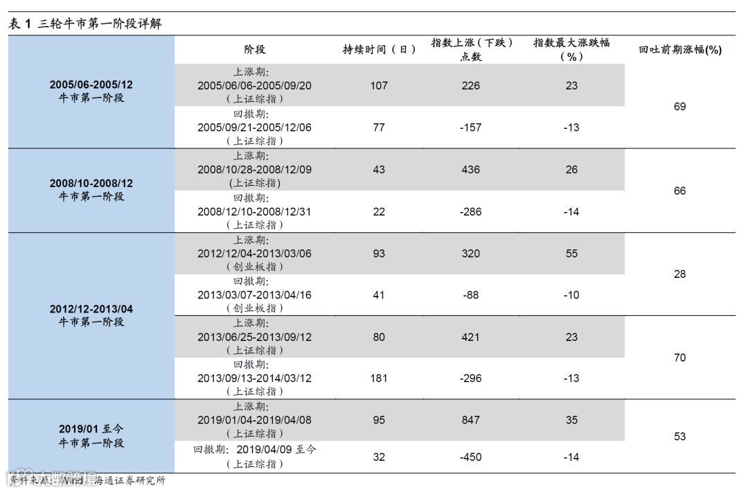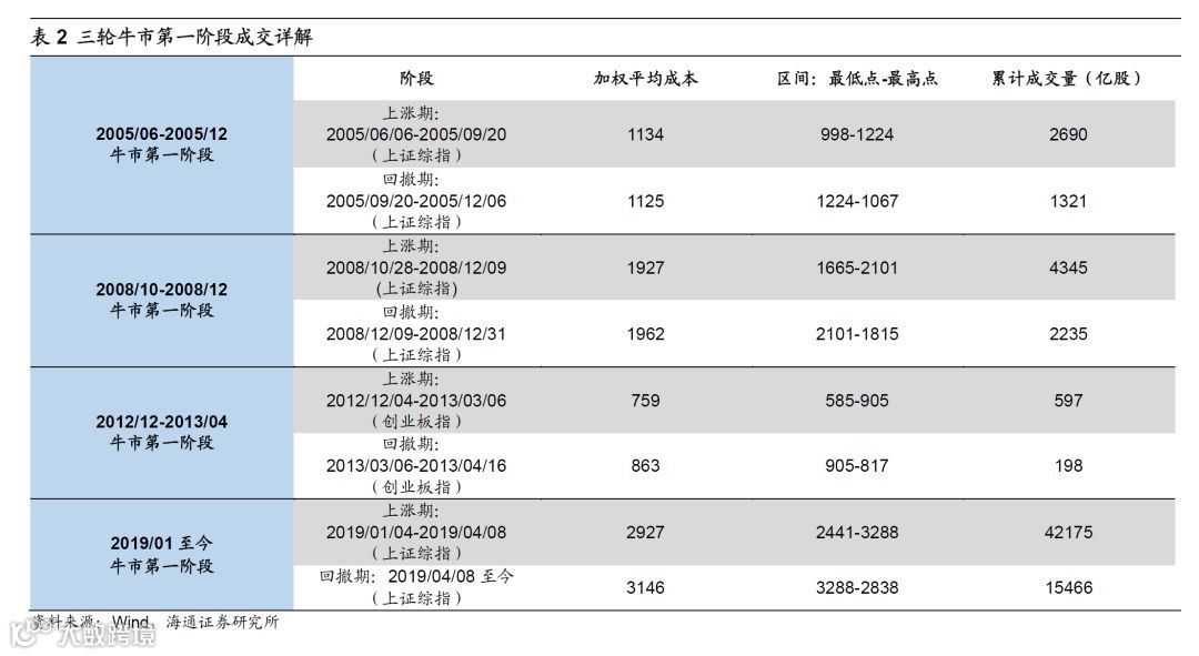 2013年6月上证综指在1849点见底后最大上涨421点至13年9月初的2270点(涨幅23%),之后回撤296点至14年3月的1974点(跌幅-13%),指数下跌约6个月,回吐前期上涨幅度的0.70。这次从2019年1月上证综指2440点见底后最大上涨847点至4月初的3288点(涨幅35%),之后回撤450点至目前的2838点(跌幅-14%),指数下跌约1个月,回吐前期上涨幅度的0.53,调整的时空还不够。此外我们用每日上证综指收盘价*全部A股成交量作为参照计算牛市第一阶段上涨和下跌区间的成交均价,发现上涨和下跌区间成交均价很接近,2005年上证综指在6-9月上涨阶段成交均价1134点,9-12月下跌阶段成交均价1125点,2008年上证综指在10-12月上涨阶段成交均价1927点,12月末下跌阶段成交均价1962点,2012年12月-13年3月创业板指上涨阶段成交均价(创业板指收盘价*创业板成交量)759点,3-4月下跌阶段成交均价863点。