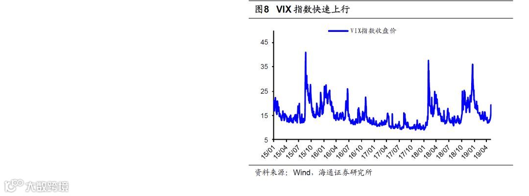 近期外资流出明显,外资对中美贸易谈判更敏感。从全球股市表现看,中美经贸摩擦升级使得全球股市普跌,最近一周涨跌幅美国标普500 -3.0%、纳斯达克 -2.1%、道琼斯 -2.1%,英国富时100 -2.4%、德国DAX -2.8%、恒生指数 -5.1%、日经225 -4.1 %、上证综指 -4.5%。VIX指数可作为观测市场情绪的重要指标,受经贸摩擦升级影响,VIX指数从4月下旬低点12.1上行至5月9日高点19.1,高于2016年以来均值14.6,说明全球风险偏好下降明显。