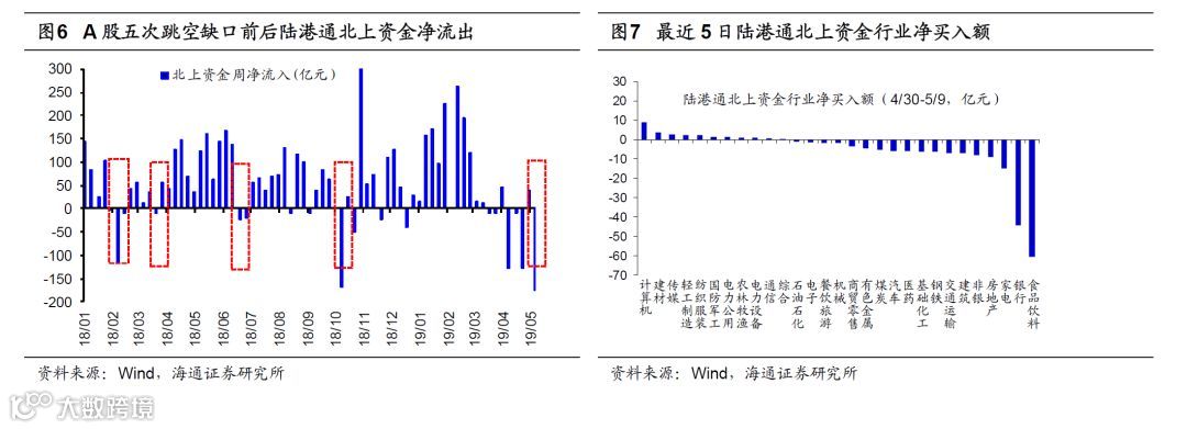 从A股资金供求看,经贸摩擦升级对股市影响主要体现在外资流出,外资较内资更关注全球配置,对全球风险偏好更为敏感,2018年四次跳空缺口前后均出现以陆港通北上为代表的外资净流出。18年2月初美股下跌前后陆港通北上资金净流出105亿元,3月22日美国总统特朗普签署总统备忘录前后陆港通北上资金净流出30亿元,6月15日美国政府发布加征关税的商品清单前后陆港通北上资金净流出60亿元,10月初美股短期跳空前后陆港通北上资金净流出190亿元。
