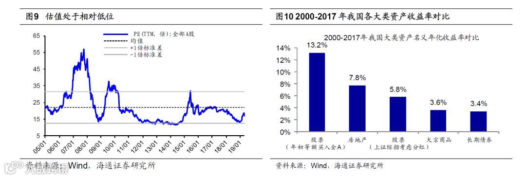 第三,从居民资产配置看,2015年中国居民资产中房地产占比高达62%,股票配置比例仅为5%,2017年美国分别为30%、32%,欧洲分别为23%、28.7%(中国数据来自《中国国家资产负债表2015———杠杆调整与风险管理》,海外数据来自《凯捷2018世界财富报告》)。2017年我国人口年龄中位数为37.8岁,居民住房需求最旺盛的阶段已经过去,现在我国已经进入后地产时代,十九大报告指出,我国要增强金融服务实体经济能力,提高直接融资比重。未来股市将得到更大的发展,A股在居民资产配置中的占比也将进一步提高。此外,5月底MSCI将把中国大盘A股纳入因子从5%增加至10%,同时以10%的纳入因子纳入中国创业板大盘A,全球配置视角下A股估值优势明显,将吸引外资持续流入。牛市大格局未变,要坚定信心。