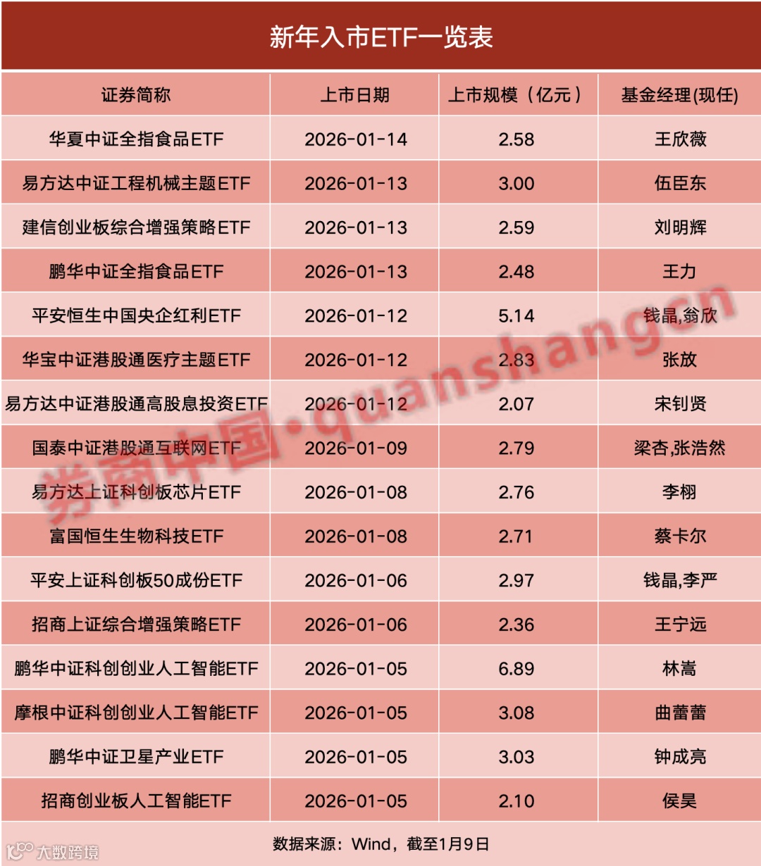 开年首周(1月5日至1月9日)已有9只ETF上市交易,涵盖人工智能、卫星、芯片、生物科技以及科创板等品类。