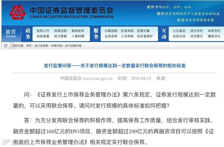 23日,证监会在发行监管问答中表示,融资金额超过100亿元的IPO项目、融资金额超过200亿元的再融资项目可以实行联合保荐。2017年修订的《证券发行上市保荐业务管理办法》中只是模糊规定,证券发行规模达到一定数量的,可以采用联合保荐。