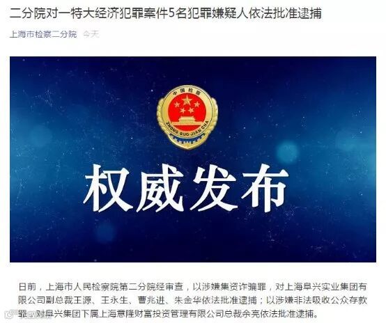 5月8日,上海市人民检察院第二分院发布消息称:“日前,上海市人民检察院第二分院经审查,以涉嫌集资诈骗罪,对上海阜兴实业集团有限公司副总裁王源、王永生、曹兆进、朱金华依法批准逮捕;以涉嫌非法吸收公众存款罪,对阜兴集团下属上海意隆财富投资管理有限公司总裁余亮依法批准逮捕。”