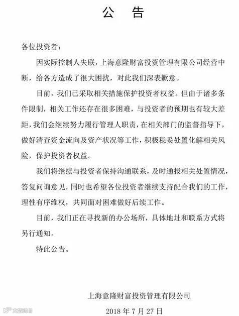 涉事私募意隆财富去年7月曾连发三条公告公布处置进展。7月27日最后的一条公告称,公司已采取措施保护投资者权益,但由于条件限制存在很多困难,会继续做好清查资金流向及资产状况等工作。