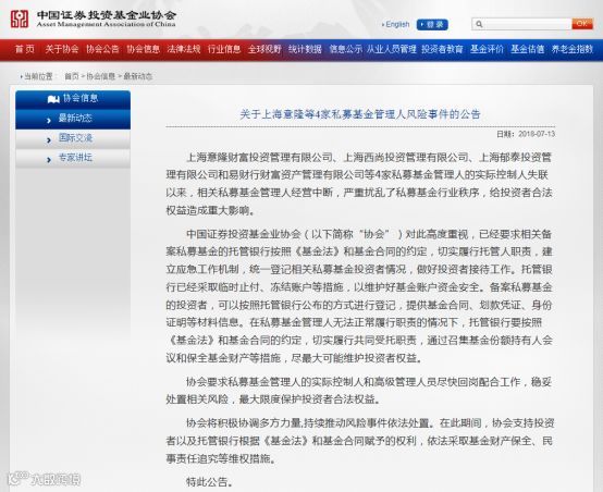 去年7月13日,中国基金业协会发布“关于上海意隆等4家私募基金管理人风险事件的公告”称,上海意隆财富投资管理有限公司、上海西尚投资管理有限公司、上海郁泰投资管理有限公司和易财行财富资产管理有限公司等4家私募基金管理人的实际控制人失联以来,相关私募基金管理人经营中断,严重扰乱了私募基金行业秩序,给投资者合法权益造成重大影响。协会敦促托相关托管银行和私募尽最大可能维护投资者权益。