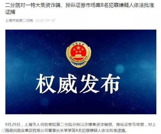 去年9月30日,上海市人民检察院第二分院也曾发布消息:“9月29日,上海市人民检察院第二分院分别以涉嫌集资诈骗罪、操纵证券市场罪,对上海阜兴实业集团有限公司董事长朱某某等8名犯罪嫌疑人依法批准逮捕。”