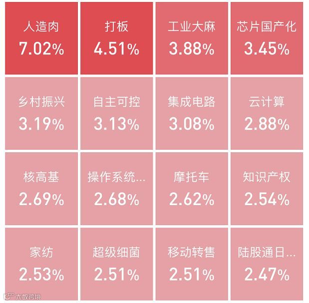 富时中国A50指数期货开盘跌1.98%。恒指低开1.3%,失守29000点,蓝筹股几乎全线杀跌,但随后略有回稳。沪深两市早盘双双低开,个股呈现普跌态势,但随后,人造肉、自主可控、软件等题材股全面开花,市场跌幅收窄,深成指、创指一度翻红。盘面上涨幅个股达53只,赚钱效应仍然存在于这个市场。