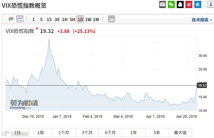 VIX恐慌指数盘中一度大涨超40%,最终收涨25%,至19.32。