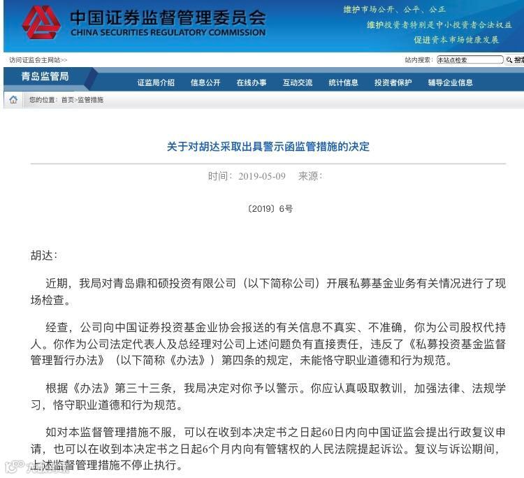 值得注意的是,除了处罚私募机构,青岛证监局还对青岛鼎和硕投资的法定代表人及总经理胡达、风控总监李勇双双开出罚单,出具警示函的监管措施。