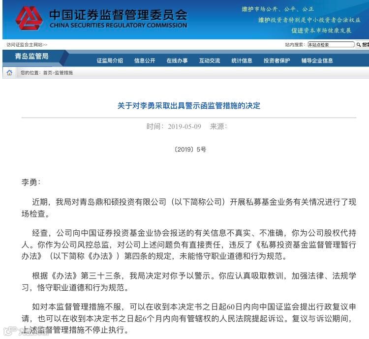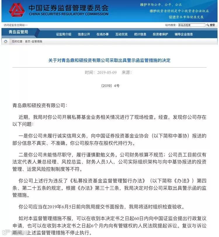经查,青岛鼎和硕投资存在报送部分信息不真实、不准确,财务核算不规范,公司股东存在股权代持行为等等。最终,青岛证监局对青岛鼎和硕投资以及两位负责人均采取出具警示函的监管措施。