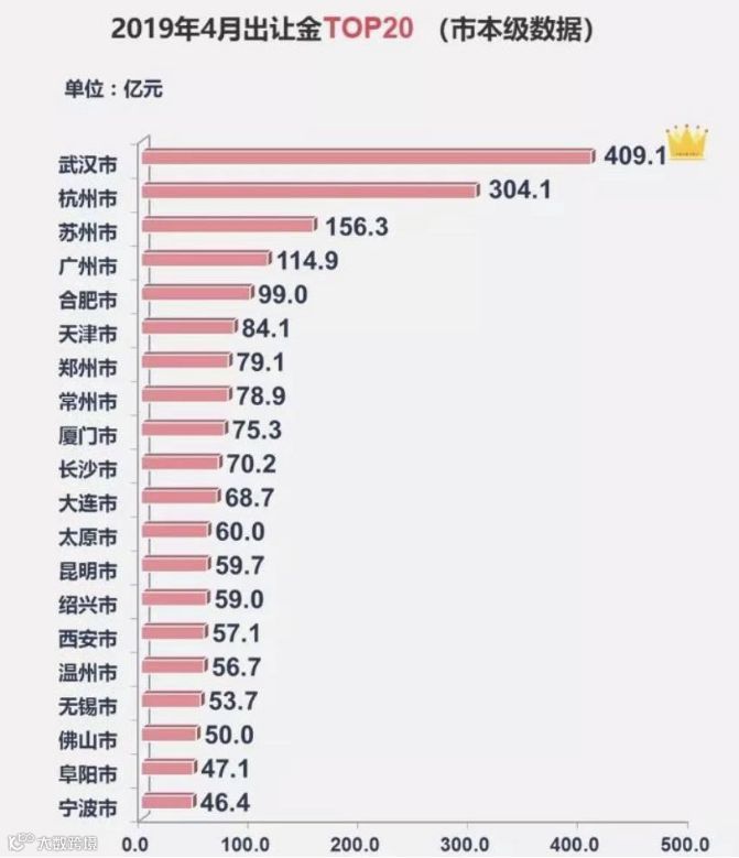 中国指数研究院的统计数据显示,4月,重点城市土地出让金TOP20排行榜中,苏州以156.3亿元位居第三。