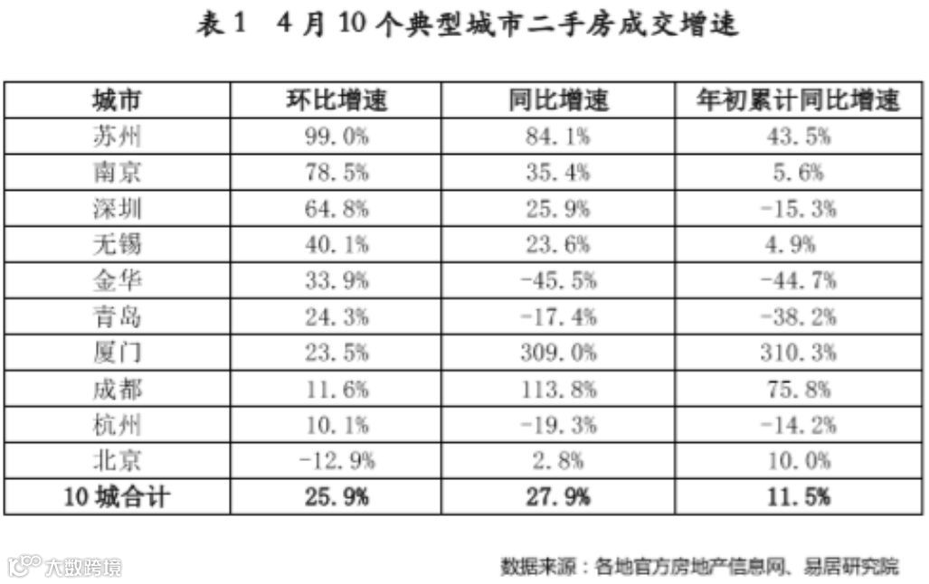 易居研究院的监测数据显示,4月,苏州二手房成交量为11748套,环比增长99.0%,同比增长84.1%,直逼2012年以来的历史最高值。4月二手房成交环比增速在10大热点城市中排名第一。