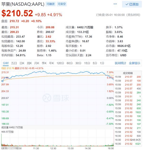 5月1日美股开盘后,苹果股价高开高走。开盘即涨4.6%,盘中股价一度涨超7%,最高报215.31美元,其市值也一度时隔六个月重回1万亿美元关口,并创下2018年10月下旬以来最高。