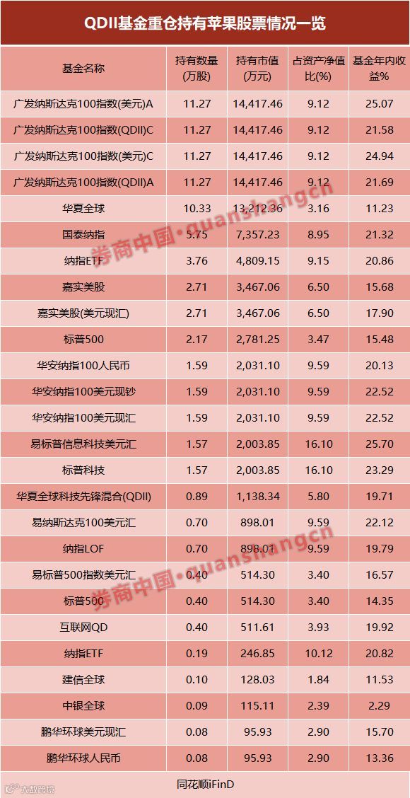 同花顺iFinD数据统计,截至2019年一季末,16只QDII基金(份额合并计算)重仓持有苹果股票,合计持有42万股,合计持有市值5.37亿元。其中,9只是被动指数型基金,7只是主动选股型基金。
