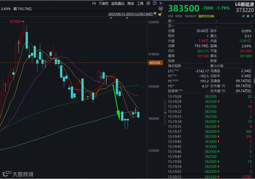 几天之前,LG新能源被福特汽车取消了规模达9.6万亿韩元的电动汽车电池供应合同,导致该公司的股价单日大跌近9%。至今,LG新能源的股价都未能收复失地。周五(12月26日),LG新能源股价下跌1.79%,市值报89.74万亿韩元(约合人民币4350亿元)。