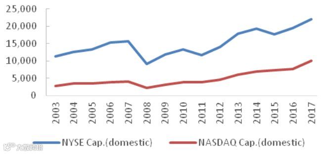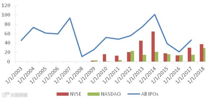 近五十年,虽然经历了互联网、能源、生物科技、共享经济、人工智能等若干次不同量级的科技革命,但纳斯达克市值规模一直远小于纽交所。金融危机之前,其市值与纽交所之比在1:4左右。2008年之后,纳斯达克与纽交所总市值之比才逐步上升至1:2。从IPO数量看,过去十多年,纳斯达克的数量一直高于纽交所,但从融资规模看,除2012年外,纳斯达克始终低于纽交所。