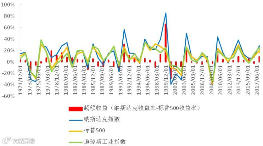 从运行环节看,纳斯达克成立头两年,指数表现好于道琼斯工业指数和标普500,但随后三年(1973—1975年),指数成长性较差。之后在绝大多数年份里,纳斯达克表现出更高成长性。