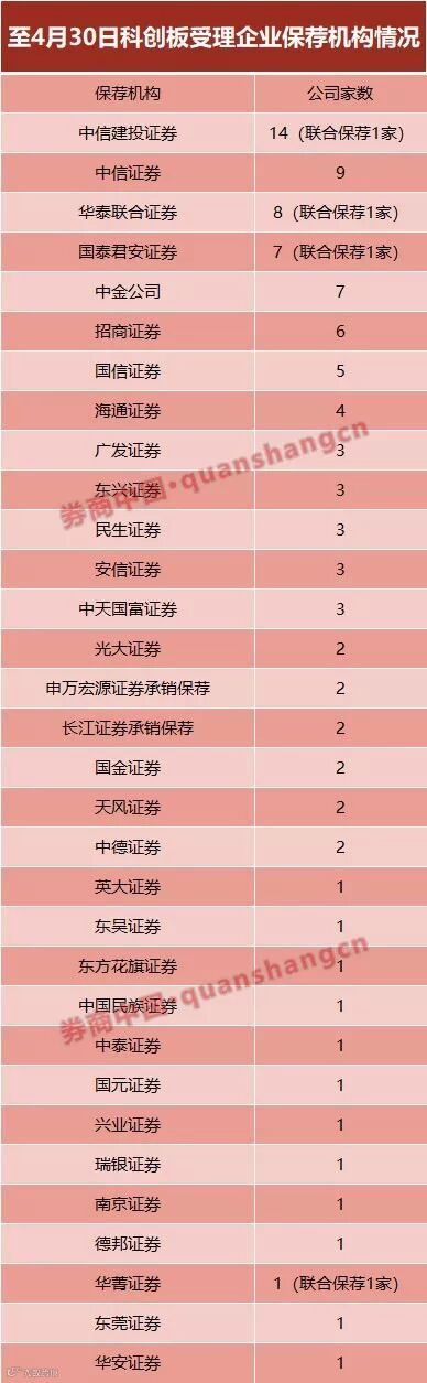 科创板跟投考验券商的业务协同能力以及资本实力,哪些券商能够占据先机?截至4月30日,上交所共受理98家企业的科创板申请,涉及33家保荐机构。