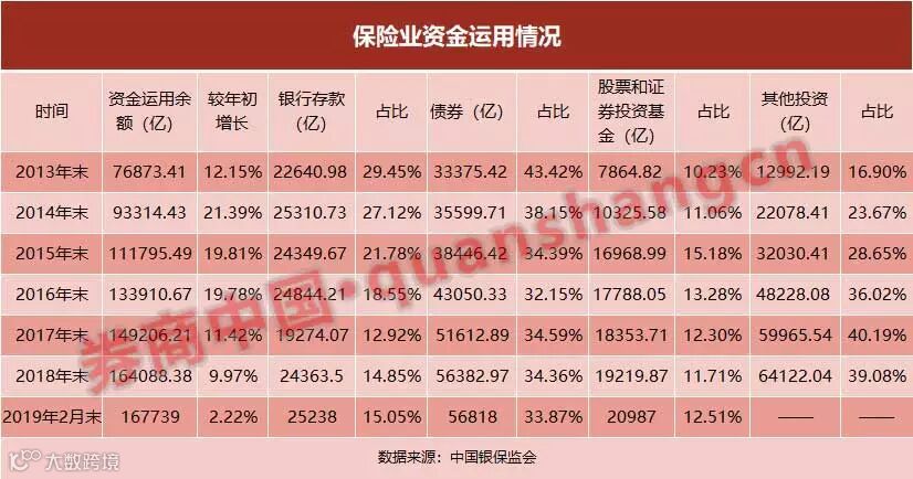 截至2018年底,保险资金规模达16.4万亿,其中11.71%的资金量即1.92万亿元投资于股票和证券投资基金,占A股流通市值的5%。不过截至2019年2月份数据,险资入市资金已经达到20987亿元,“市值”两个月飙升1767亿元,在投资规模中的占比上升至12.51%。