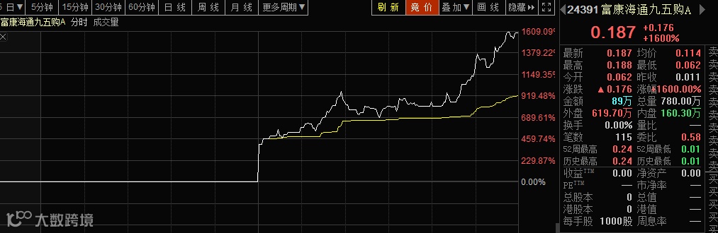 受此消息提振,香港和内地股市相关个股纷纷启动,鸿海系富智康集团、鸿腾精密、云智汇科技、讯智海纷纷大涨,其中富智康全天大涨接近30%,富康海通九五认购证更是大涨16倍。