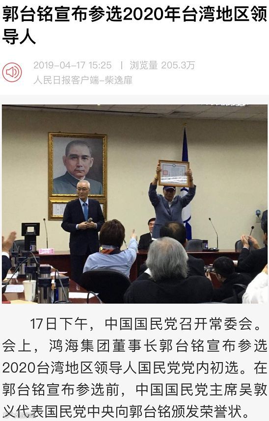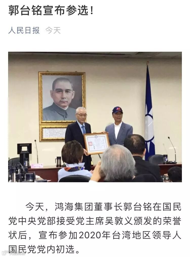 据人民日报消息,17日下午,中国国民党召开常委会,鸿海集团董事长郭台铭宣布参选2020台湾地区领导人国民党党内初选。