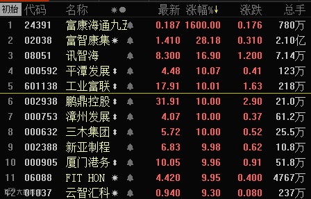 A股市场率先启动的是与台湾一海之隔的福建板块,平潭发展、三木集团、漳州发展、厦门港务皆封涨停板,工业富联强势封板,富士康概念股新亚制程涨停,宇环数控等亦有反应。