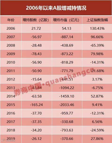 据券商中国记者梳理,参照WIND统计口径,按照截止日来统计,从2007年开始,A股市场已经连续12年净减持(不包括19年),至今已经净减持715.33亿股,估算减持市值达1.13万亿元(含19年)。