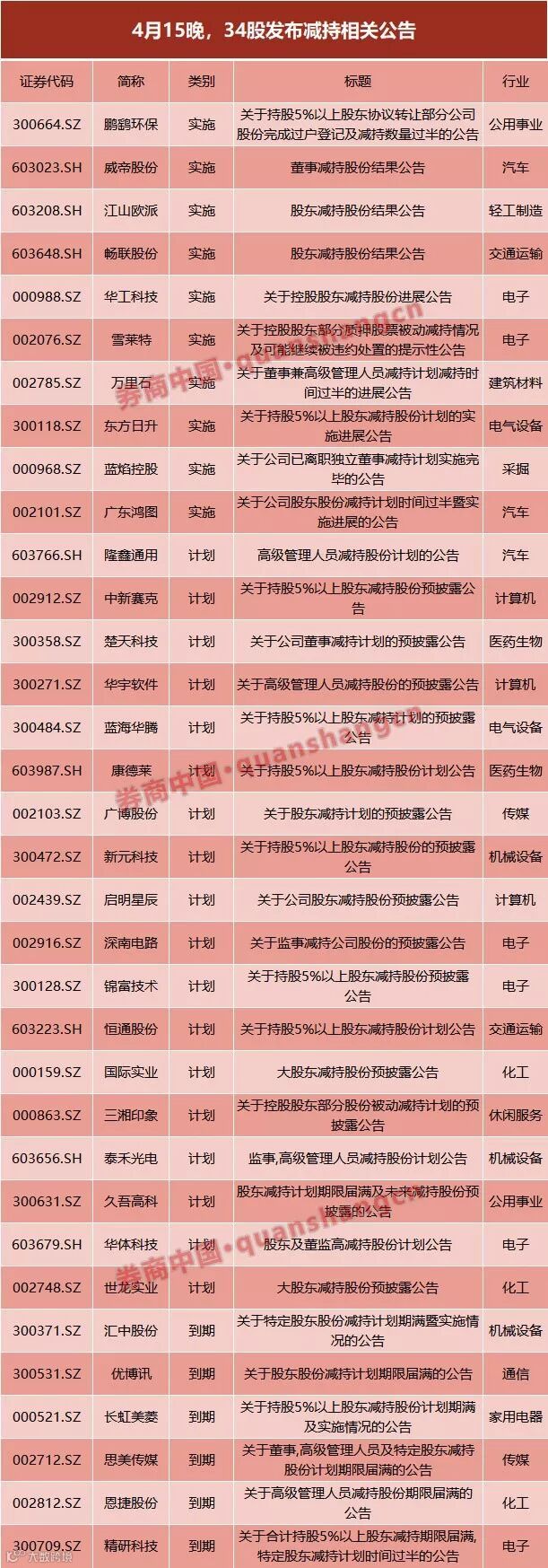 减持继续是15日晚间的热门公告主题,据券商中国记者统计,共有34股发布了减持相关公告,包括发布新的减持计划、宣布减持实施,以及宣告减持计划到期等。其中,有10只个股发布减持实施公告,有18只个股发布了减持计划,有6只个股宣告减持计划到期。