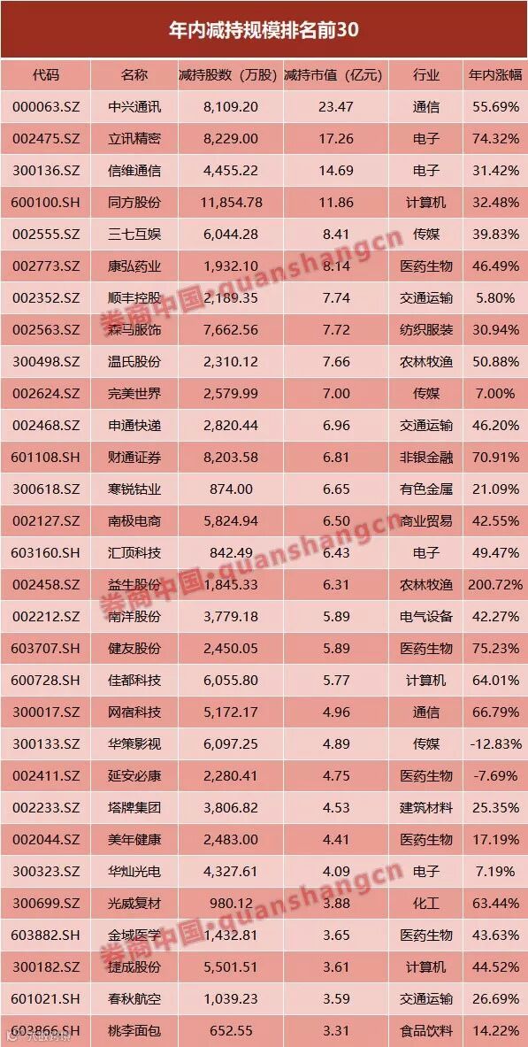 中兴通讯是年内最大减持个股,年内累计被减持8109.2万股,减持市值23.47亿元,主要是中兴新通讯公司卖出。