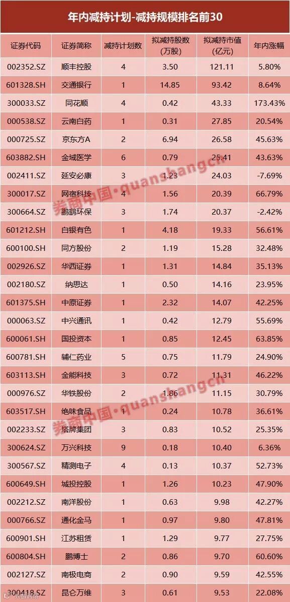 就拟减持规模来看,上述减持计划中,有353股拟减持超1亿元,有144股拟减持超3亿元,有79股拟减持超5亿元,有24股拟减持超10亿元,有9股拟减持超20亿元,顺丰控股、交通银行和同花顺等3股拟减持超40亿元。