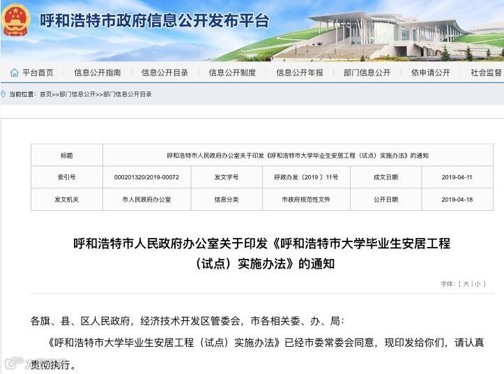 4月18日,内蒙古呼和浩特市人民政府办公室关于印发《呼和浩特市大学毕业生安居工程(试点)实施办法》的通知公开。其中提及,具有普通全日制本科及以上学历的应往届毕业生(往届3年及以内),可半价买房。文件指出,大学毕业生住宅平均销售价格按照项目所在区域市场价格的50%确定,产权交易涉及相关税费按规定由建设单位和购房者分别承担,5年内不得上市交易。市场价格每年调整一次,由辖区政府提出,经市住房和城乡建设主管部门审核备案后执行。采取按揭或公积金贷款的,首付比例最低可按20%支付。