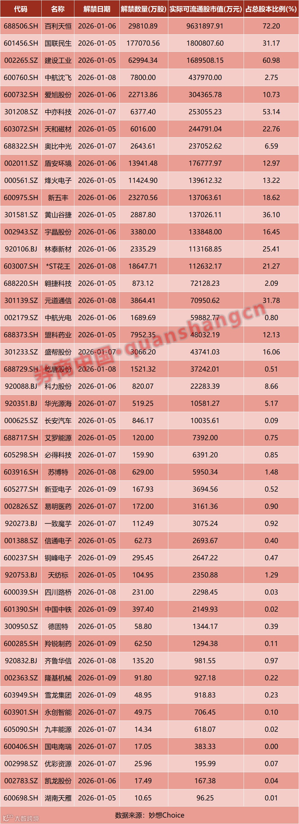 从解禁占比来看,解禁占比居前三位的是:百利天恒(72.2%)、建设工业(60.98%)、中亦科技(53.14%)。