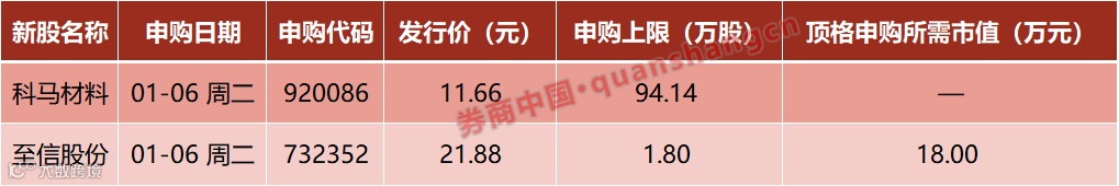 本周(1月5日—1月9日)有2只新股发行,周二:科马材料、至信股份。