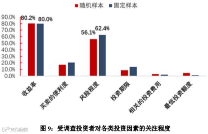 9.收益率和风险程度是受调查投资者投资金融产品的主要考虑因素,收益率的关注度高于风险程度。但超八成投资者不愿承担较大的风险。