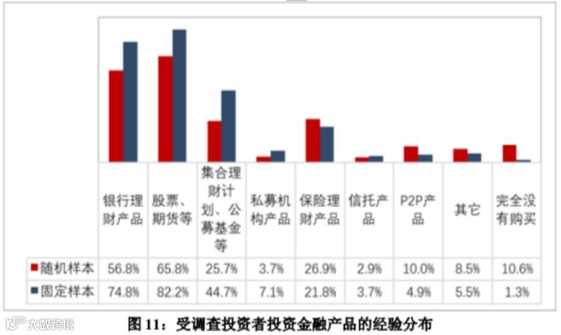 从财务状况来看,近八成受调查投资者收入主要来源于工资、劳务报酬,超九成的年度税后收入在50万以下,二成固定样本和三成随机样本投资者背有房贷、消费贷等债务。股票、存款和银行理财是受调查投资者选择最多的金融品种,其中股票的投资金额最多。