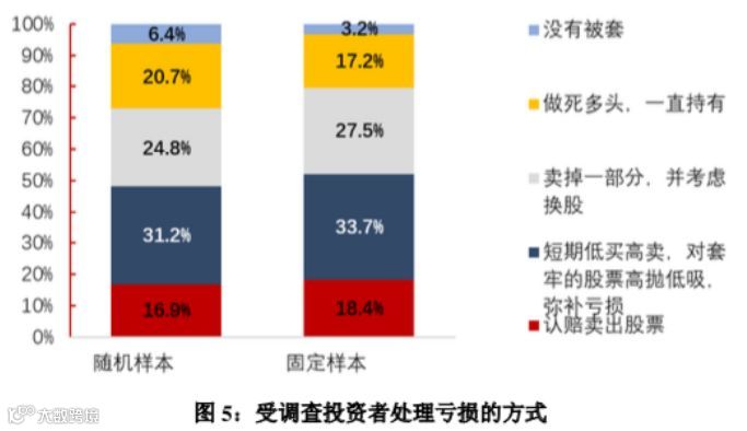4.对待盈利及亏损的态度:受调查投资者把股票变现的盈利区间集中在10%-50%,普遍通过换股和高抛低吸两种方式处理亏损。产生焦虑情绪的亏损比例集中在10%-30%(含)和30%-50%(含)两个区间。