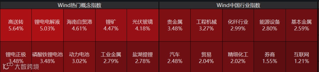 来直观地感受一下今天早上A股盘面的情况。在涨幅居前的指数当中,锂电电解液、锂矿、锂电正极、磷酸铁锂、动力电池等集体爆发。个股更是大面积涨停或涨幅超过10%。