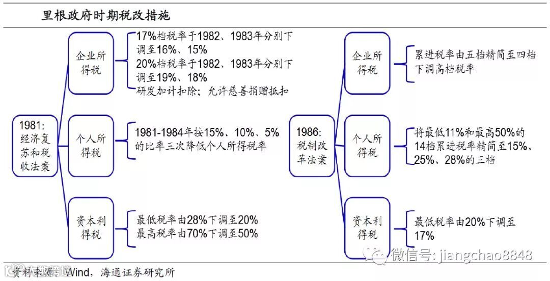 里根的另一大政策主张是减税,其在任期内实施了两次大规模减税政策,将企业所得税、个人所得税和资本利得税三大税率均大幅下调。而大幅减税激活了美国企业的研发创新和居民消费,使得经济重新恢复了活力。美国经济在1983年以后重拾高增长,失业率也从10%以上的高位缓慢下降。自里根上台以后美国经济终于摆脱了持续十余年的滞胀局面,并为之后克林顿的繁荣时代打下了基础。
