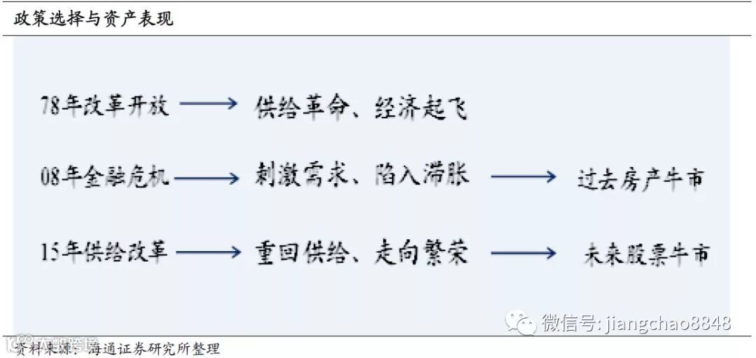 中国在过去10年货币超增、债务率持续上升,经济增速下行而房价持续暴涨,其实就是类滞胀的状态。而在痛定思痛之后,2015年11月,中国正式提出了供给侧结构性改革,这其实类似于美国的“供给学派”改革,意味着我们也把经济增长的重心转回到了供给端。