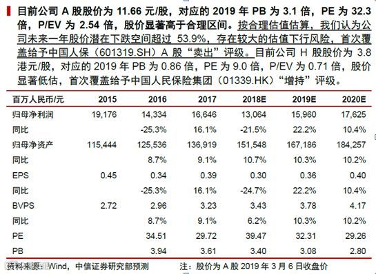该报告结合3月6日数据称,中国人保H股股价3.8港元/股,对应的2019年PB为0.86倍,PE为9.0倍,P/EV为0.71倍,股价显著低估,首次覆盖给予中国人保H股“增持”评级。