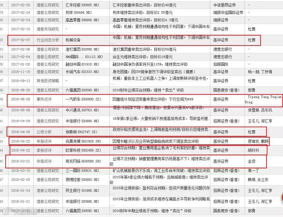 高华证券倒是给出不少卖出评级,2016年,对中国中车、一汽轿车、埃斯顿、凤凰传媒、用友网络、欧非科技等个股给出“卖出”评级。但高华证券,是高华和高盛合资成立的,属于中外合资券商。