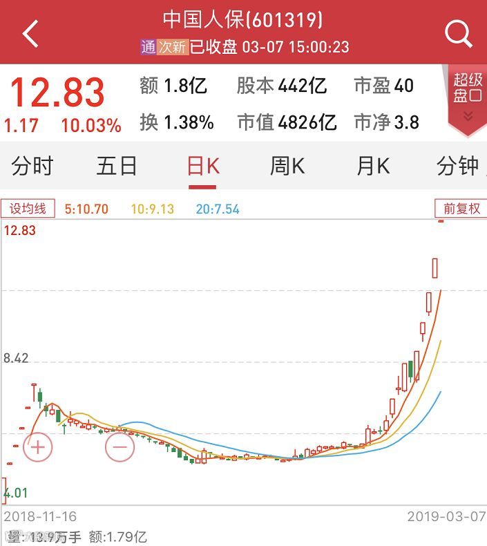 中国人保是去年11月16日在上交所上市的次新股,442亿股的总股本中,流通A股仅10.11亿股,流通盘小。数据显示,中国人保今年1月1日的流通盘仅54亿元,即便涨到现在,流通市值也仅100多亿元,与其他几只保险股数千亿的流通市值不是一个量级。