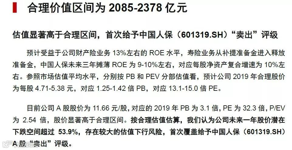 而截至报告发布前的3月6日,中国人保A股股价为11.66元/股,对应2019年PB为3.1倍,PE为32.3倍,P/EV为2.54倍,股价显著高于合理区间。按合理估值估算,预计公司未来一年股价潜在下跌空间超过53.9%,存在较大的估值下行风险,因此首次覆盖给予中国人保A股“卖出”评级。