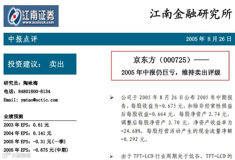 然而,不可否认,江南证券是基于企业的基本情况给出的判断。因为在2004年7月-2005年7月,京东方的股价从4元一路跌至1元附近,业绩处于亏损状况。除了这份“卖出”报告,记者几乎没找到哪家国内机构给出“卖出”评级。