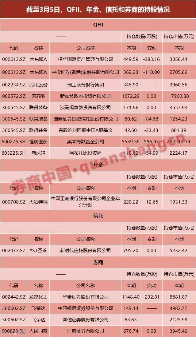 截至3月5日数据,QFII、年金、信托和证券公司的披露持股情况如表格。
