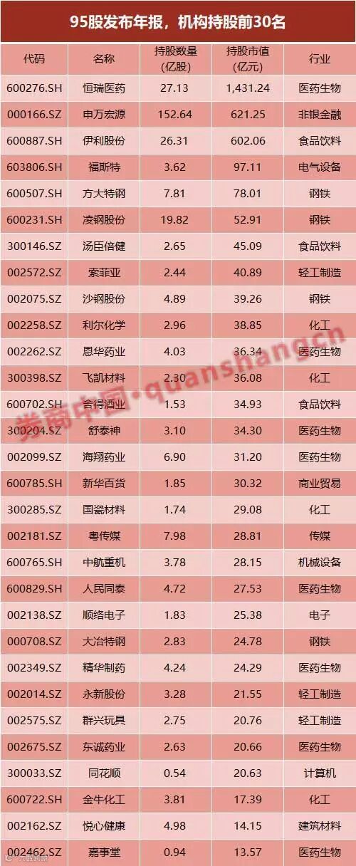 据券商中国记者统计,截至目前,两市已发布95份年报,其中有93家公司涉及机构持股,机构持股股数合计360.3亿股,持股市值3843.78亿元。