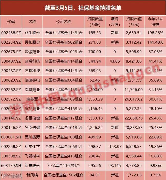 值得一提的是,在社保基金的7只新进个股中,益生股份、民和股份的股价已经翻倍,今年以来(截至3月5日)累计上涨198.26%、141.48%,同时东诚药业、蓝晓科技的股价涨幅也超40%。