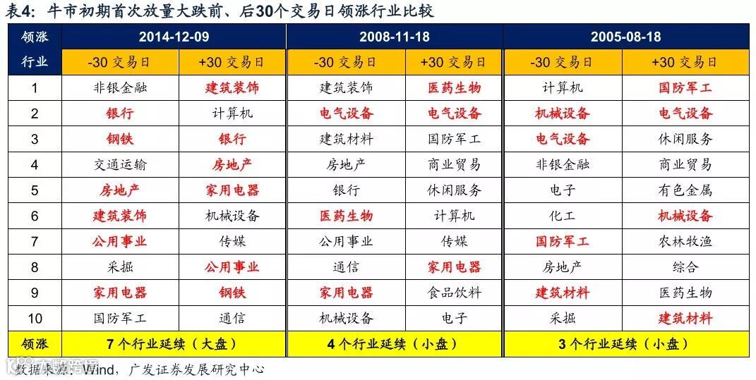 (3)成长股领涨行业会有一些切换——在首次放量大跌前后30个交易日:14年大盘股风格下,大跌前领涨的10个行业中,在大跌之后有7个依然领涨;但是在08年和05年小盘股风格下,大跌前领涨的10个行业中,在大跌后仅有3-4个行业依然领涨。