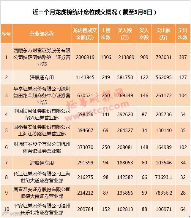 其中,西藏东方财富证券拉萨团结路第二证券营业部作为后起之秀,期间累计上榜次数达到1306次,成交金额约合201亿元,两项指标均位居龙虎榜之首,远超去年全年水平;今年以来该营业部出击的个股主要集中证券、有色、医药生物、通信、机械设备等板块,出击了东方通信、风范股份多只热门概念股。