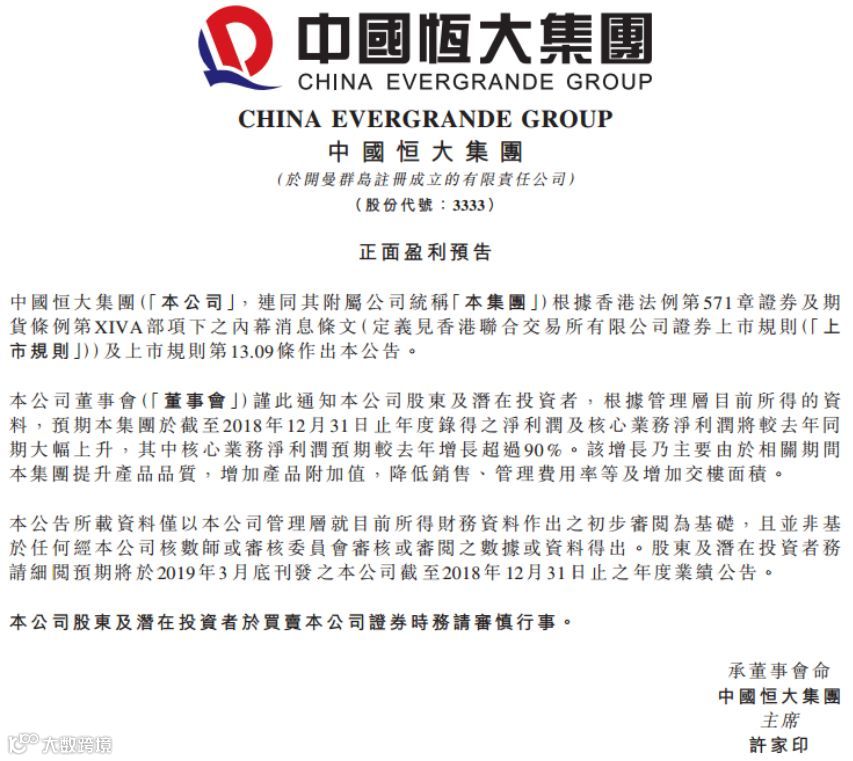 日前,恒大发布了正面盈利预告,2018年净利润和核心业务净利润均实现大幅增长,其中核心业务净利润同比大增90%以上。以恒大2017年核心业务净利润405.1亿估算,意味着其2018年核心业务净利润达770亿以上,刷新行业最高纪录。